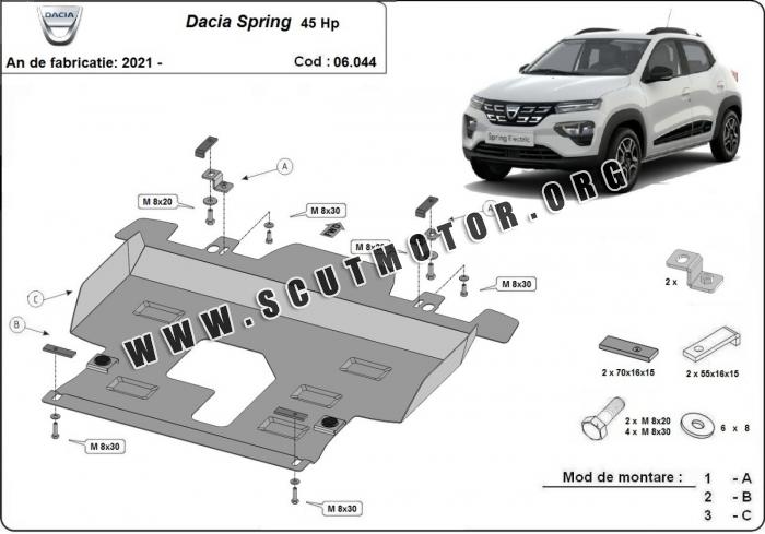 Scutul este nouă și se potrivește perfect pentru toate tipurile de motorizare Dacia Spring fabricat între ani 2021 - 2026.