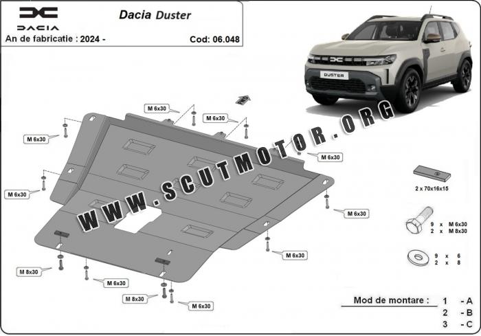 Scutul este nouă și se potrivește perfect pentru toate tipurile de motorizare Dacia Duster fabricat între ani 2024 - 2026.