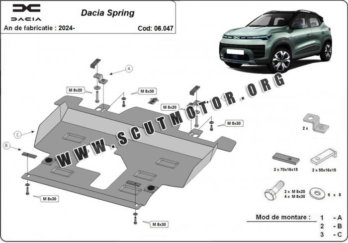 Scutul este nouă și se potrivește perfect pentru toate tipurile de motorizare Dacia Spring fabricat între ani 2024 - 2026.