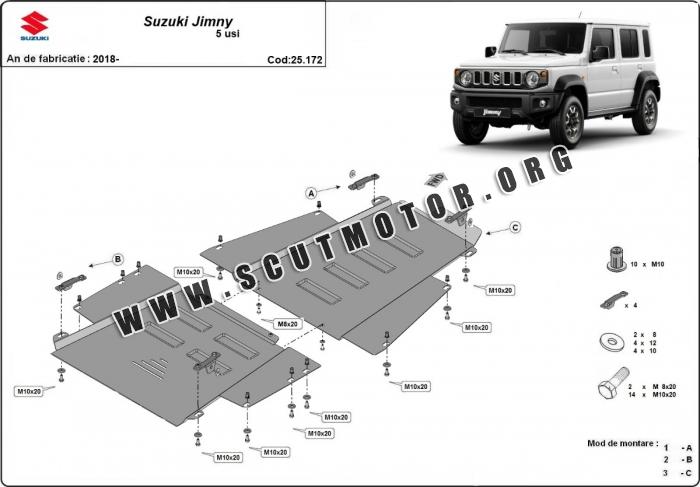 Scutul este nouă și se potrivește perfect pentru toate tipurile de motorizare Suzuki Jimny fabricat între ani 2018 - 2026.